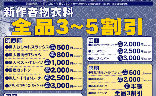 NEW 2026年3月15日お知らせかねい呉服店 当店の大創業祭、残り3日です!!3月12日より開催しております、当店の大創業祭も、残すところあと3日となりました。 年に一度の大特価セール。 ぜひ、この機会に遊びにお越しください。 かねいの創業祭 期間:3月12日~3月17 […]